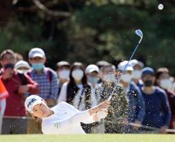第2日、1番でバンカーショットを放つ渋野日向子。通算7アンダーで首位=武蔵丘コース