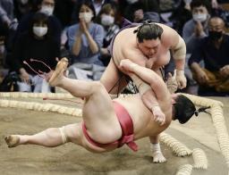 照ノ富士(上)がすくい投げで大栄翔を下す=福岡国際センター