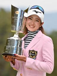 通算17アンダーで優勝し、トロフィーを手に笑顔の原英莉花=エリエールGC松山